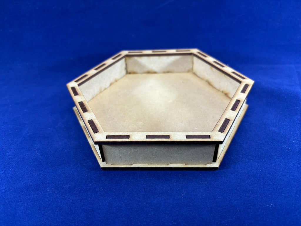 Upgrade your tabletop or role-playing game setup with this precision-cut hexagonal MDF dice tray! Measuring 178mm (7 inches) across, this sturdy tray keeps your dice rolls contained and your table scratch-free. Its clean laser-cut design and natural MDF finish make it perfect for painting, staining, or leaving as-is for a rustic look. Great for D&D, Warhammer, Pathfinder, or any tabletop RPG or board game. Easy to assemble, compact and durable — a must-have for any gamer who wants to roll in style!